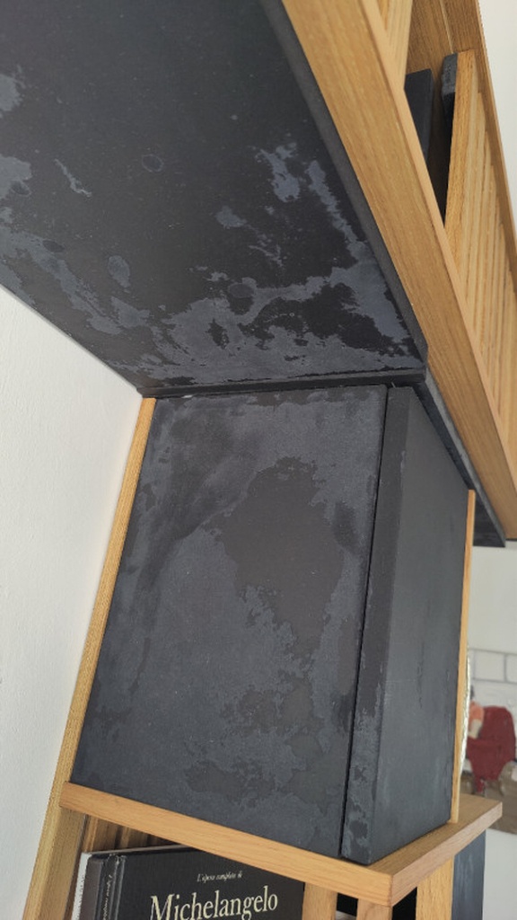 J'a un gros souci sur un meuble récemment livré, des marques sont apparues sur du valchromat noir huilé à l'huile de tung, comme si l'huile avait été complètement absorbé par endroit. Comme une image vaut mieux qu'un..., en voici quelques unes :