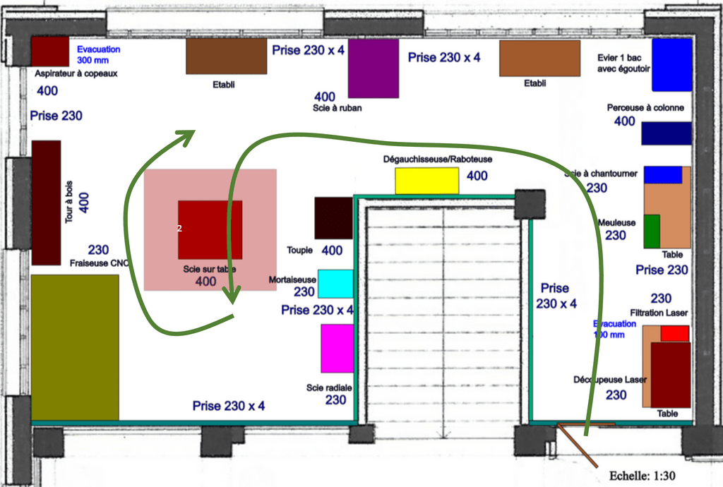 BrutDePomme c'est difficile a expliquer sans schéma du coup j'ai un peu dessiné sur ton plan. En gros il faut projeter les flux pour se rendre compte. Sur le plan avec les flèches vertes j'ai tracé le parcours avec un panneau type CP qu'on aurait besoin de débiter (ça fait pas mal de virages). Sur le plan avec les flèches rouges c'est le parcours avec un bois brut (là encore il faut pas être nombreux dans le local). Ma proposition c'est celle avec la flèche bleue l'idée est de disposer les machines "dans le sens de production" pour éviter les manutention inutiles (et risquées).