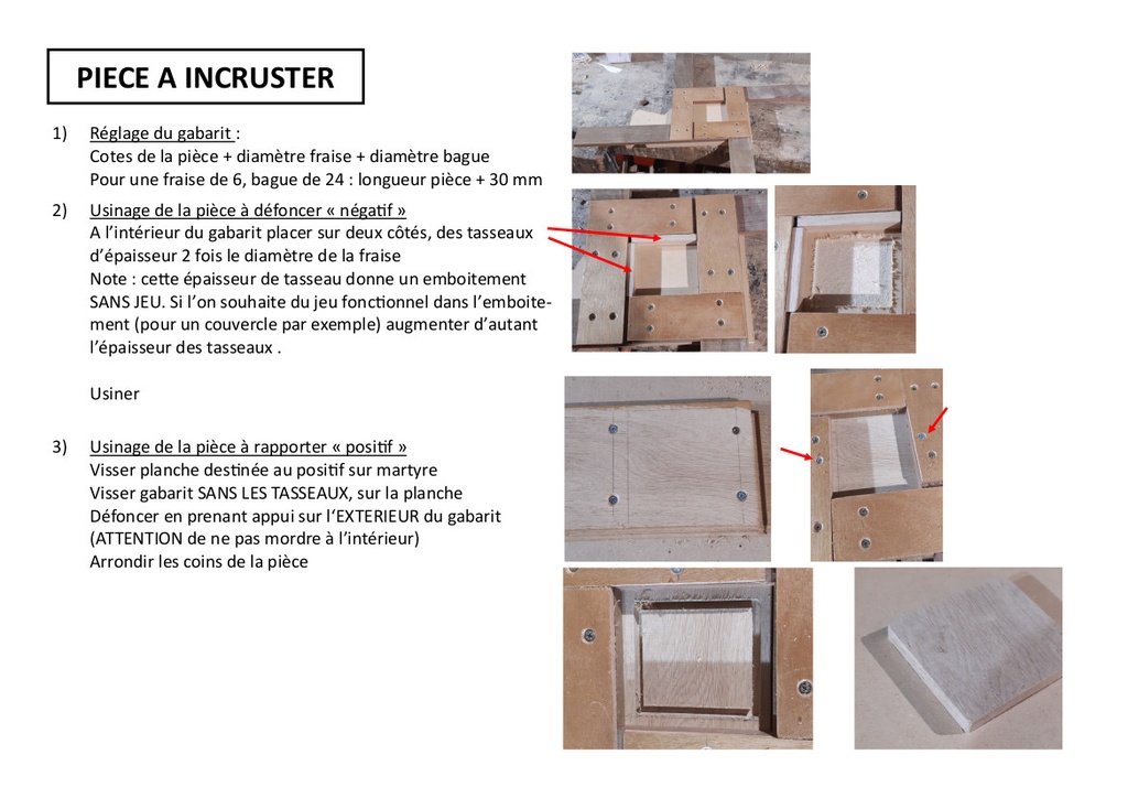 - si tu ne veux pas faire de fraisage complémentaire pour les angles je te conseillerai de faire des gabarits d'angles male et femelle en était très soigneux. Ensuite du dégrossis tes formes puis tu fixes tes gabarits et tu usines la forme avec une fraise à copier comme ça tu auras de la répétabilité et de la précision. Attention à faire tes gabarits assez grands pour pouvoir les fixer sans gêner la défonceuse.
