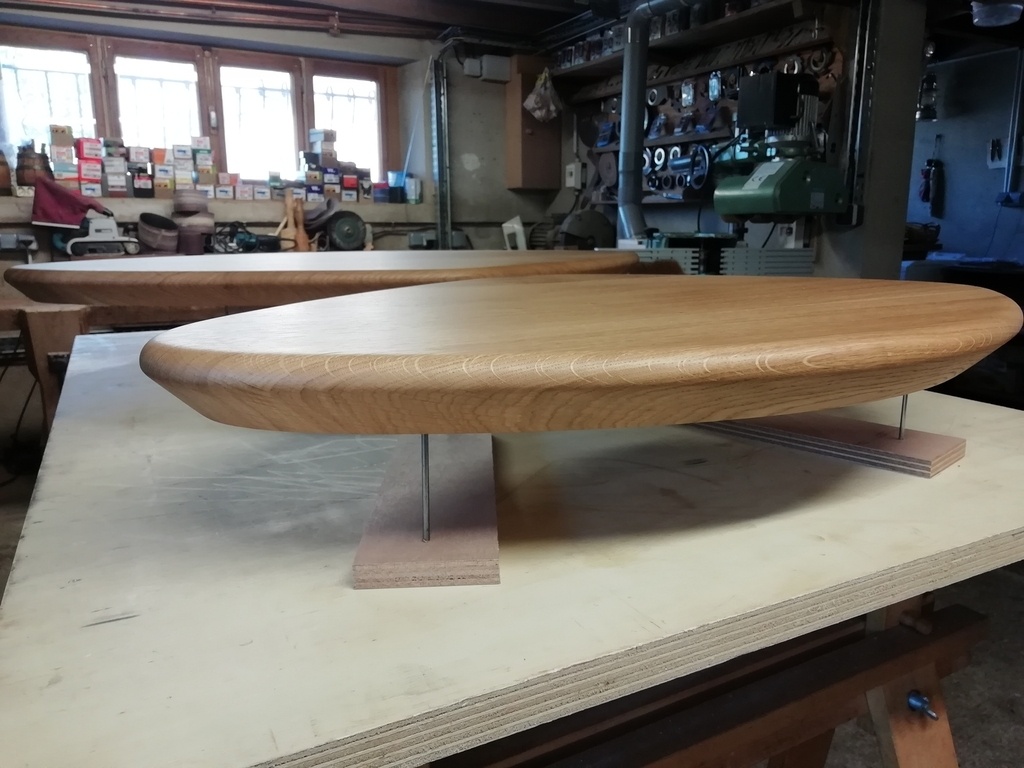 Les tables sont terminées. Je vous fais un retour sur la technique utilisée. Finalement j'ai tout fait à la défonceuse. J'ai hésité à utiliser la toupie avec l'entraîneur en laissant seulement une roue pour maintenir la pièce plaquée sur la table tout en la faisant tourner librement. Mais je trouvais la méthode peu orthodoxe alors j'ai joué la sécurité. Je ne sais pas si vous avez déjà expérimenté cette methode ?