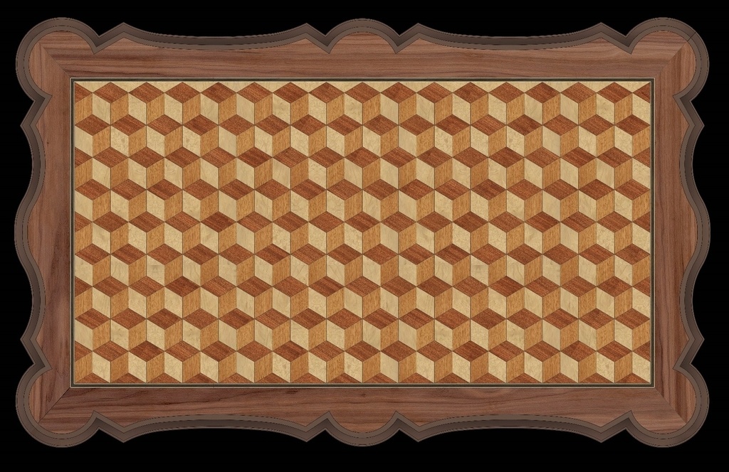 le plateau est décoré en marqueterie de cubes sur le dessus et non traité sur le dessous.