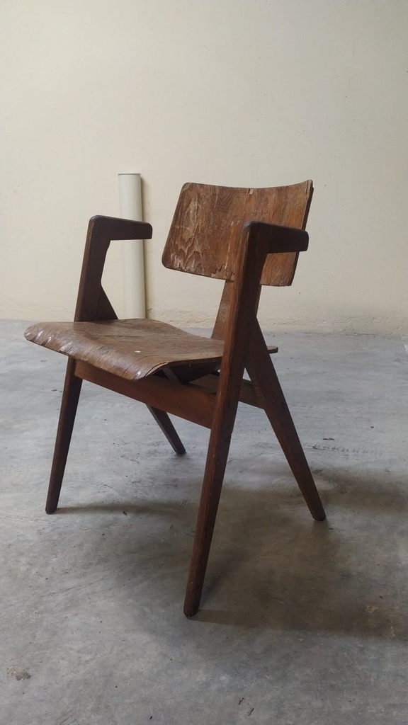 J'ai récemment trouvé une petite merveille mise aux encombrants qui demande restauration. Ce fauteuil date des années 50 et a été réalisé en frêne contreplaqué (pour l'assise et le dossier).