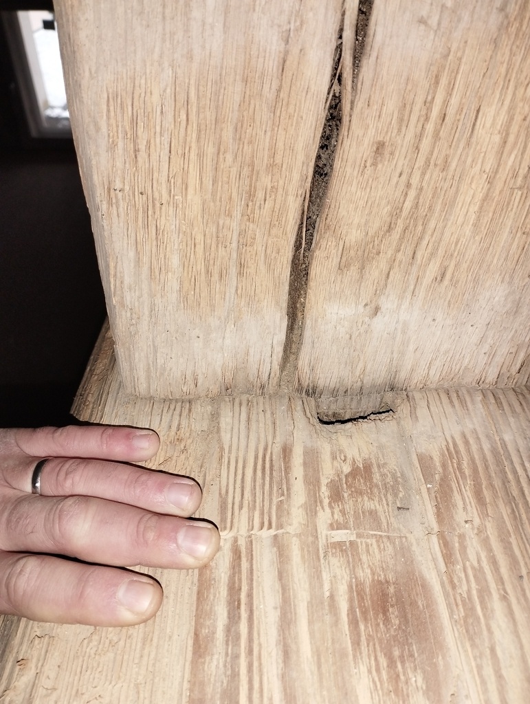 Au niveau d'un des appuis sur le mur, l'entrait est complètement dégradé. Les anciens propriétaires ont mis en place un poteau béton sous l'arbalétrier afin de soutenir l'entrait. Il ont également mis un poteau bois vers le centre de l'entrait.