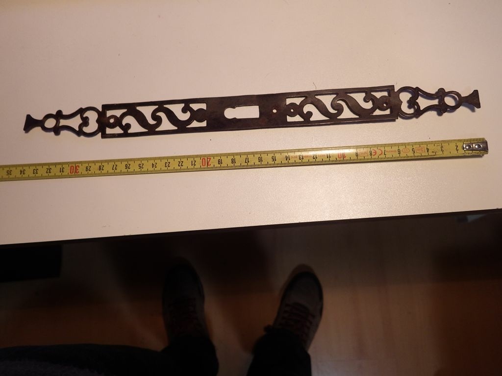 J'ai pris un bout de tôle, une disqueuse, des limes et une pointe à tracer, et bidouillé les deux petits bouts qui manquaient. Soudés à l'arc sur une plaque d'alu pour essayer de dissiper la chaleur, c'est tout fin genre 1mm , avec des mini électrodes à 20amp, par petites touches. martelé, poncé, brossé, un coup d'hématite, un peu de limage pour fignoler, et laine d'acier fine pour terminer après l'hématite.