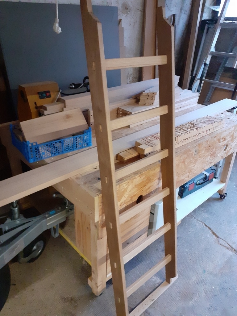J'ai réalisé une petite échelle en chêne pour accéder à un lit en hauteur (type lit superposé). Elle fait 1,60m et est destinée à des enfants avec une utilisation peu fréquente (maison de vacances). Elle sera sécurisée en partie haute avec 2 crochets.