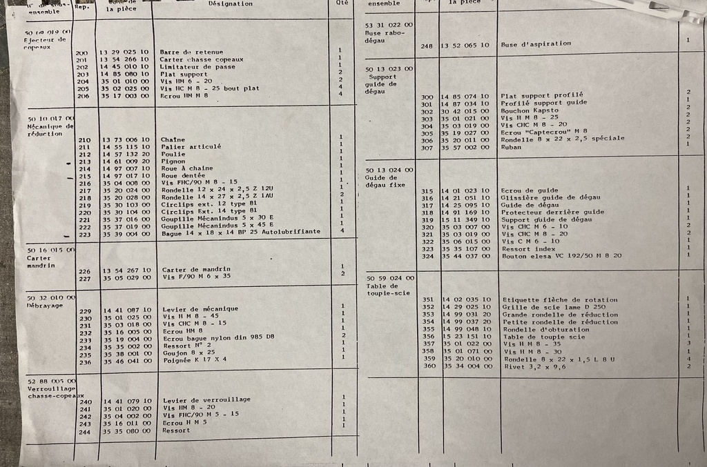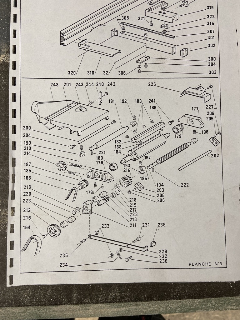 « Si on reprend le plan que j’ai ajouté aux photos, j’ai changé les bague « 223 » mais pas celle qui viennent au niveau de la poulie car là c’est des roulements » : je pense que tu veux dire que sur l’arbre de rabotage, ce sont des roulements ? Les bagues que tu as changées, pour moi on en voit deux sur les photos 4 et 5, et elles ont pour repères 190 et 193 (encore une idiotie Lurem, dans une nomenclature on n’a qu’un seul repère pour des pièces identiques, ce qu’on vérifie ici par la référence identique ! Même chose pour les ressorts… Et bonjour la qualité des dessins, le plancheux était encore moins doué que moi : dans le boitier de paliers 177, il n’y a même pas le passage des rouleaux d’entrainement !!!)