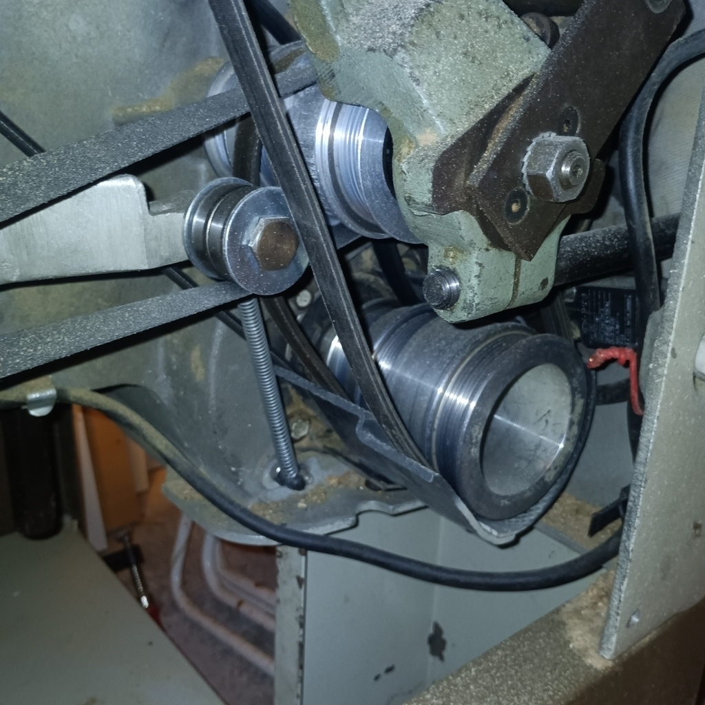 Je ferai une photo de la position des courroies car cela pourra me servir quand je devrai changer celle qui est effilochée depuis un bon moment. J'ai observé que pour faciliter le réglage en hauteur de l'arbre de toupie il faut tourner celui-ci dans un certain sens afin sa courroie d'entraînement ne quitte pas son galet de tension (autre courroie).