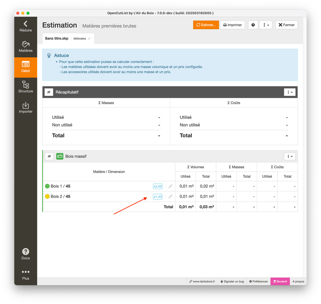 En revanche, ce que me montre ton besoin est que ça serait bien que ce coefficient soit paramétré sur la matière et non global à l'estimation. Ainsi on pourrait avoir une différence entre les essences.