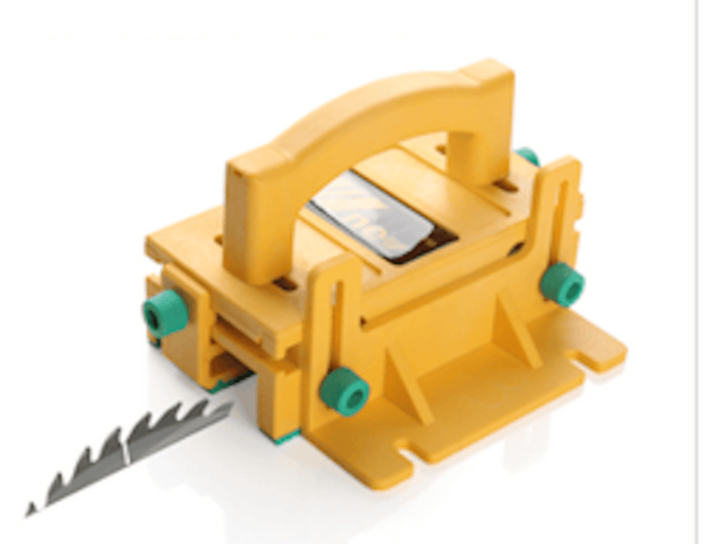 Enfin, le troisième accessoire est vraiment très utile quand tu n’as pas de gabarits ou de position confortable (et donc sécuritaire) sur une scie sous table ou une défonceuse sous table. C’est probablement celui que j’utilise le plus, surtout pour couper de fines lamelles de bois. Là encore, tu peux le fabriquer toi-même ou l’acheter (une vingtaine d’euros de mémoire). Personnellement, je l’ai acheté (mais tu peux le faire toi-même ou une version imprimée en 3D) : il est bien entaillé de partout à force de servir, mais il fait toujours très bien le boulot. Sa grande force, c’est sa modularité.