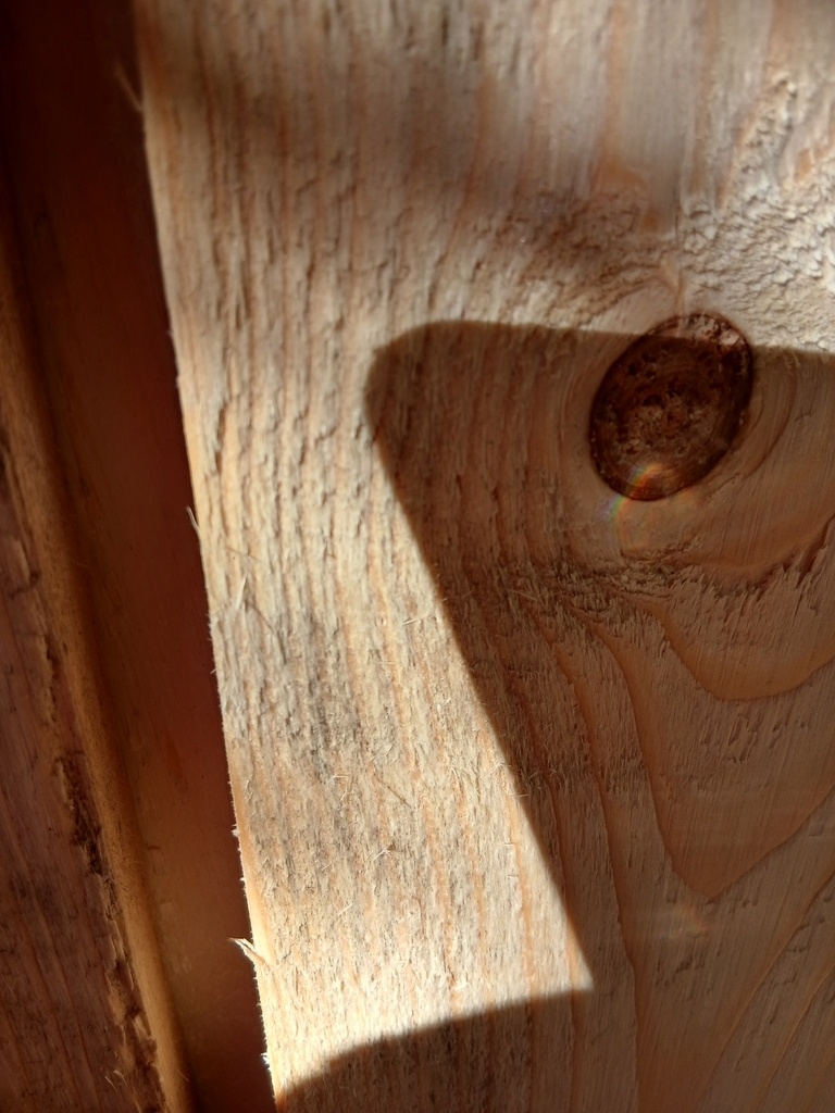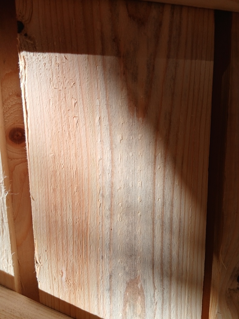 Les planches de coffrage provenaient d'une cour de matériaux. Je les ai entreposées sur chant pendant une semaines dans ma cave, avec des cales et une ventilation pour les sécher et les stabiliser. J'ai ensuite raboté les deux chants avant d'appliquer un traitement anti-xylophage/champignons en trois couches appliquées au badigeon. À présent, le bois affiche une hygrométrie entre 20 et 32 % (mesurée avec un testeur pour bois de cheminée).