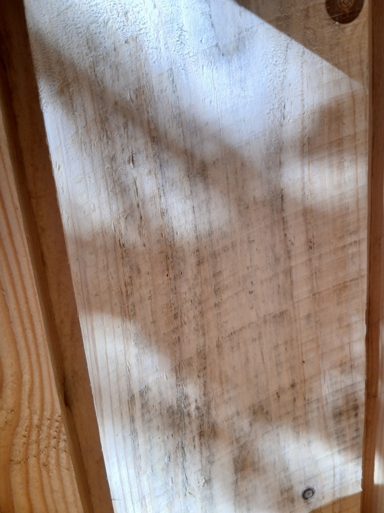 J'observe l'apparition de tâches noires sur les planches de coffrage (voir photos ci-dessous). Les tâches noires sont de texture poudreuse et semble pénétré profondément dans le bois puisqu'elles sont parfois présentent même en délignant 1 cm de matière (cas rares). Elles s'enlèvent facilement au grattage superficiel mais persistent en subsurface. Certaines ont commencé noires et se sont développées avec un liseré blanc alentour avant traitement anti-fongique. Je n'ai pas observé ce type de développement blanc depuis le traitement.