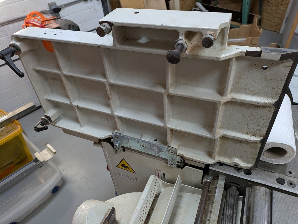 Pour la dégau la table de sortie est dans le plan de la table scie/toupie et réglée d'usine. S'assurer que la table d'entrée est coplanaire ou dans un plan parallèle au plan de la table de sortie. Les fers sont réglés avec l'arête tranchante dans le plan de la table de sortie. L'arbre n'est pas à régler sauf en usine et avec la table de sortie.