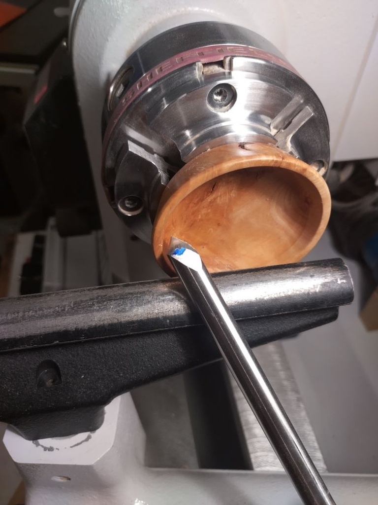 Faut-il avoir la gouge dans cette position ? légère inclinaison vers le bas (donc gouge juste pas parallèle avec le banc du tour) et une rotation de 90° vers l'intérieur du bol ? Dans cette position je vois bien comment talonner mais ensuite on fait comment pour augmenter le diamètre intérieur du bol ? suffit de tourner légèrement la gouge dans l'autre sens jusqu'à ce que ça commence à gratter sur la partie haute de l'aiguisage ?