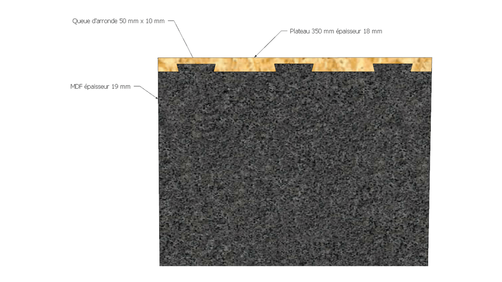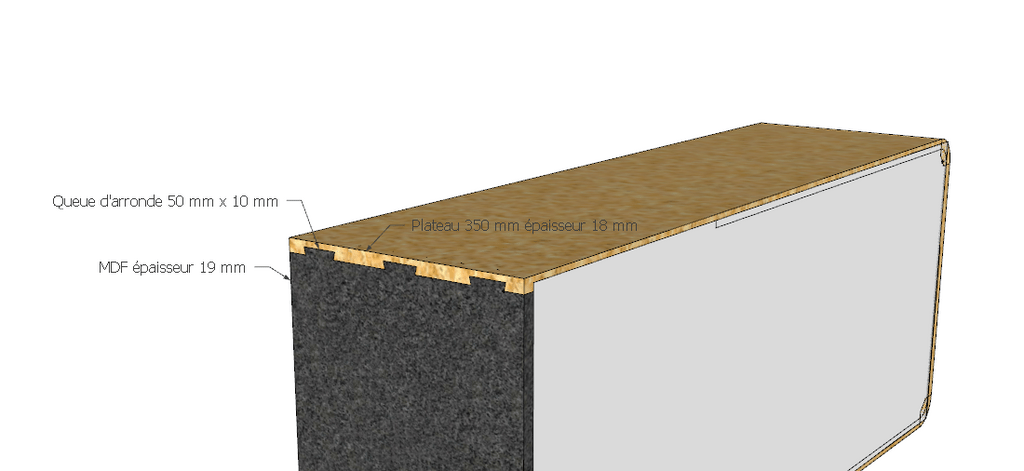 Pour le flanc du meuble j'ai pensé à un assemblage en queue d'arronde recouvertes qui me plait esthétiquement comme sur la vue de côté ci-dessous :