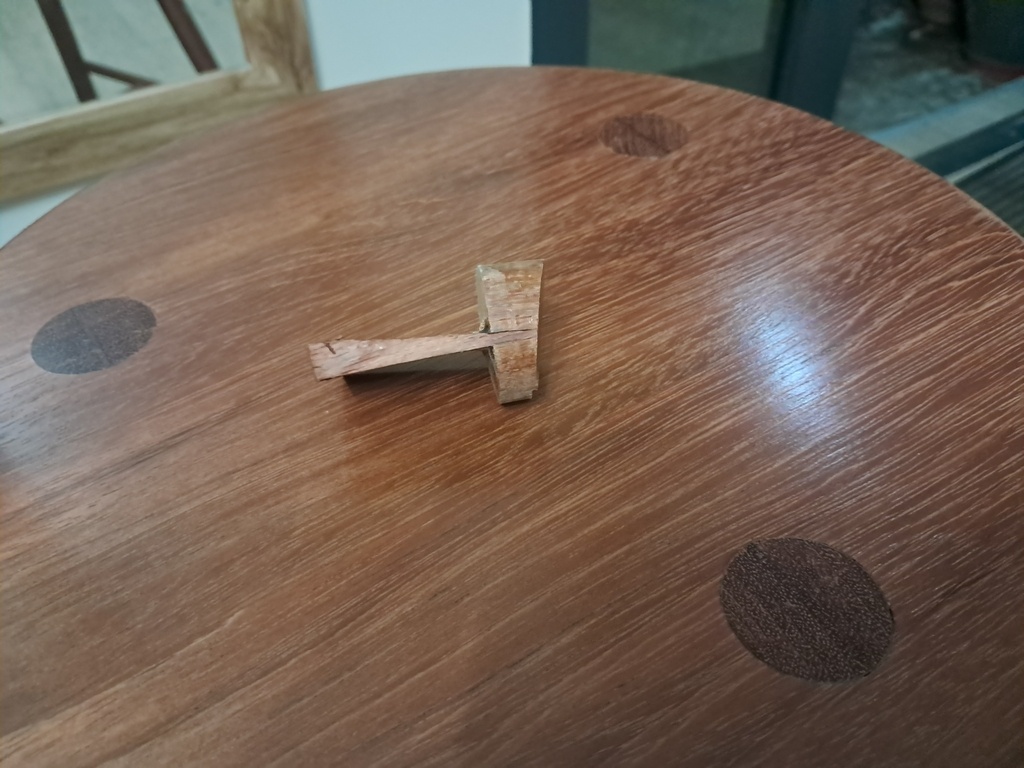Je suis en train de faire un tabouret avec les pieds qui s'emboitent dans des mortaises débouchantes sur l'assise. Un coin vient bloquer l'assemblage.