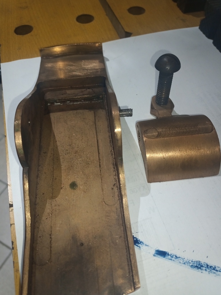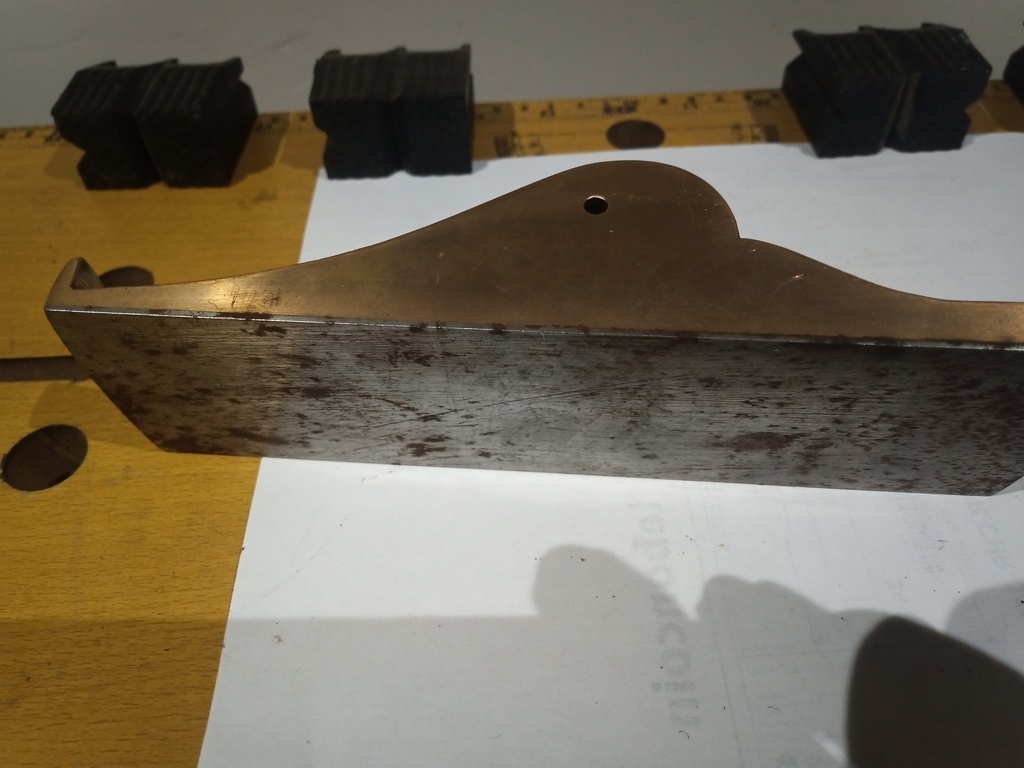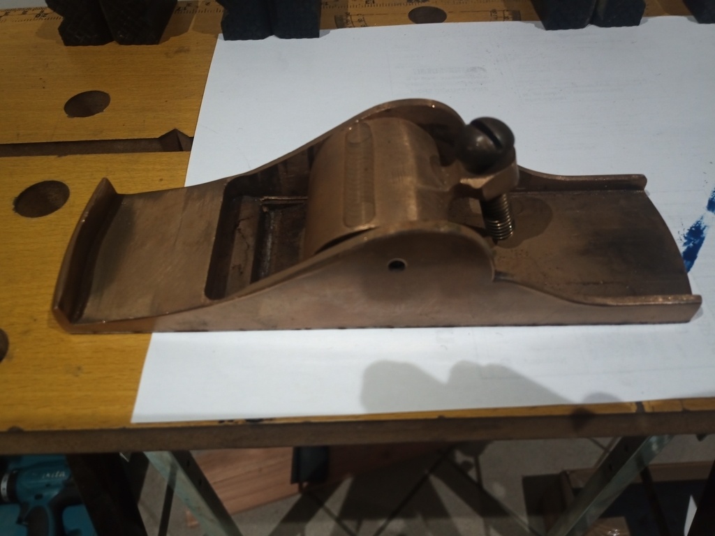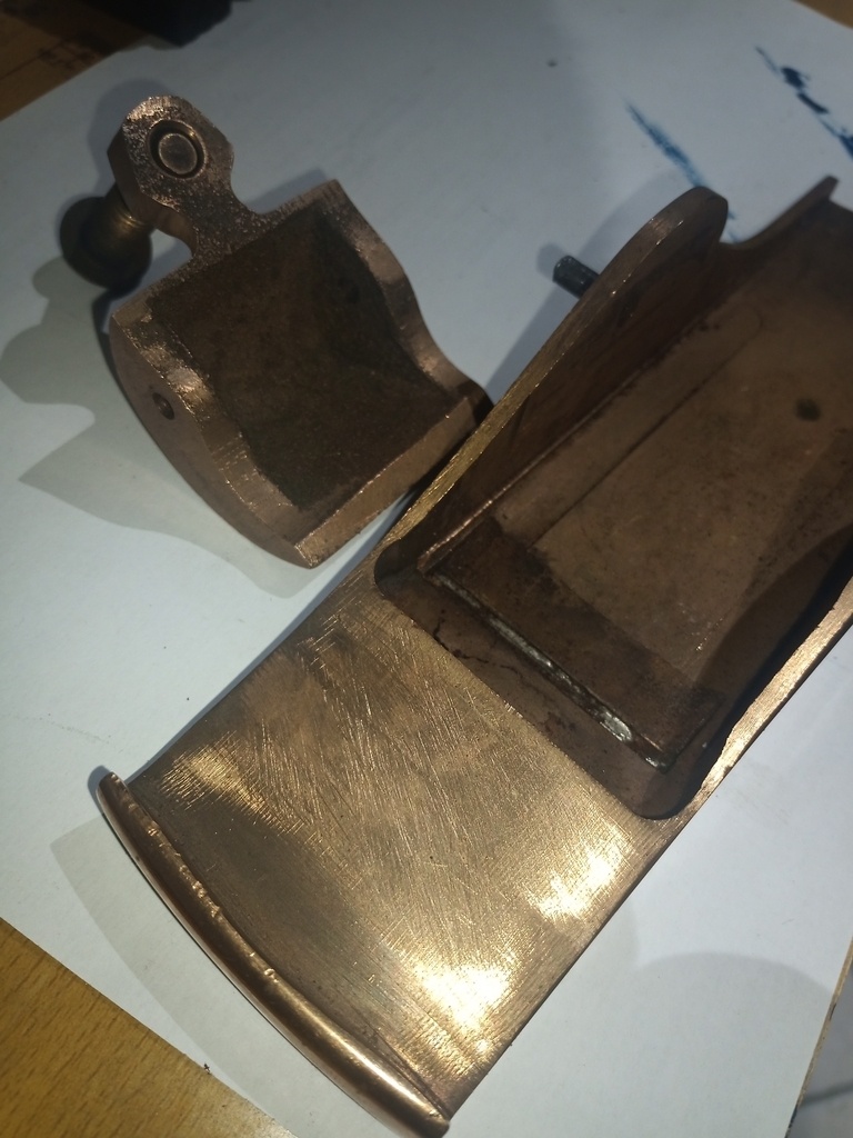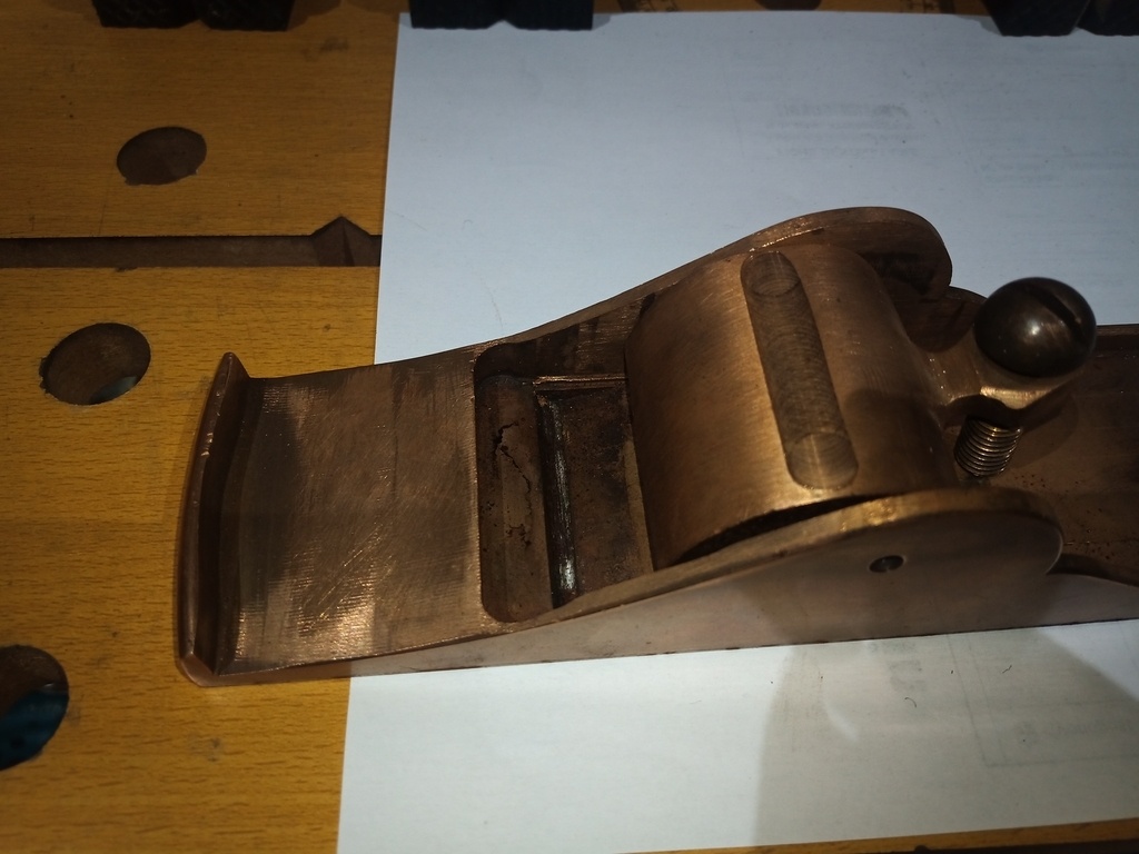 Quand on regarde bien au fond de ton rabot sur la 4e photo, on dirait qu'il y a une lumière taillée à travers le laiton (ou bronze?) et que la tôle en fer a recouvert. Il s'agit peut-être d'une tentative de restauration de la lumière et de la semelle ?