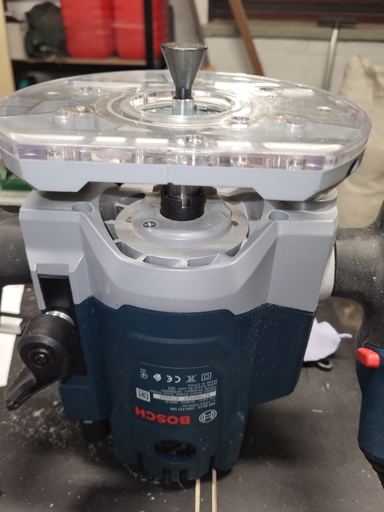 Sur la Bosch 2012, le système qui maintient les bagues de copiage est vissé avec 2 vis tête fraisées sur la semelle en plexi. C'est auto centré, il est donc impossible de centrer la bague à ce niveau.