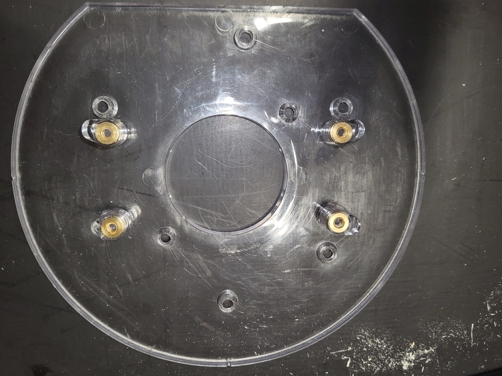 La semelle plexi est bien maintenue sur la semelle alu par des têtes plates. Mais elle a des ergots qui la bloque par rapport à la semelle alu. Il est donc également impossible de centrer la bague à ce niveau.