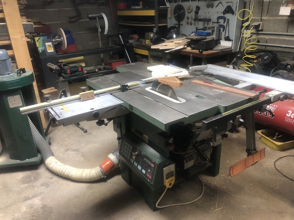Sinon on peut régler l'orientation du bloc scie avec 4 vis situées sous la table ou aussi le support de la règle par 2 vis Chc (photo).