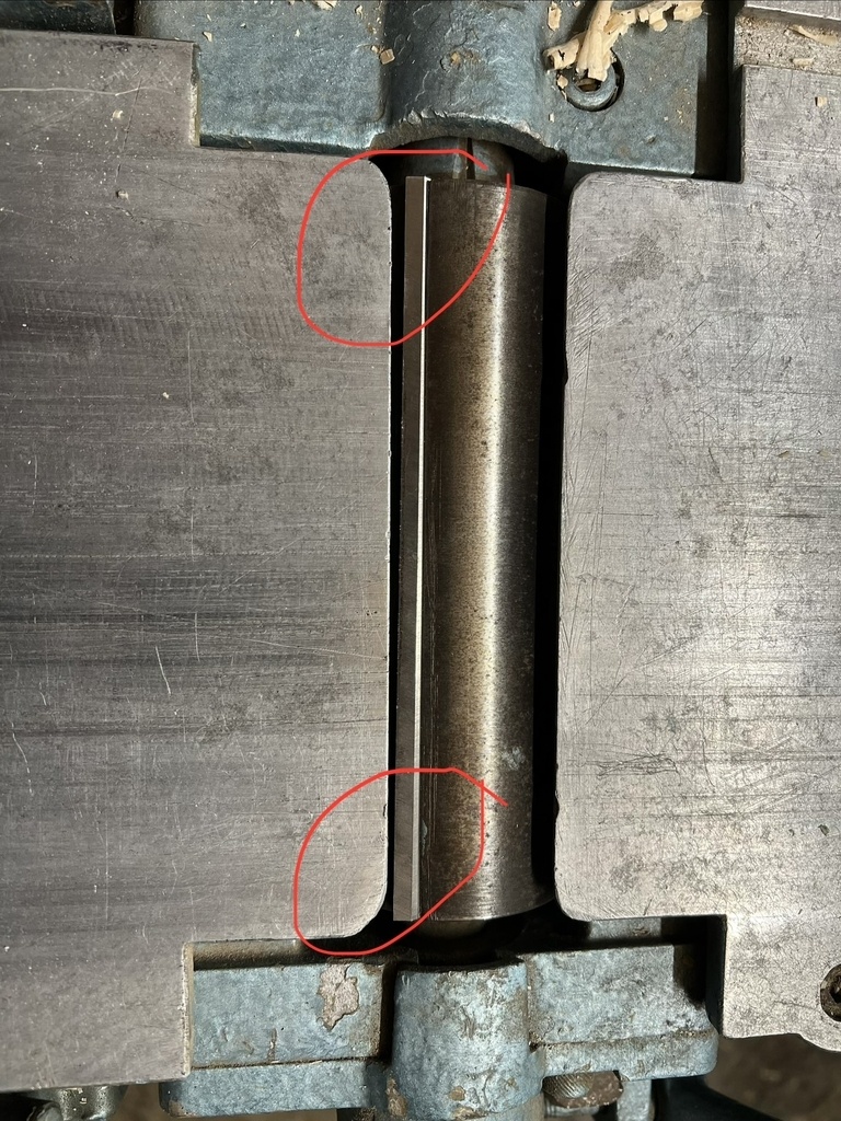 Les fers sont certainement bien réglés mais les tables n'étant pas parallèles à l'arbre de la raboteuse les fers se retrouvent non parallèles à la table de rabotage dessous.