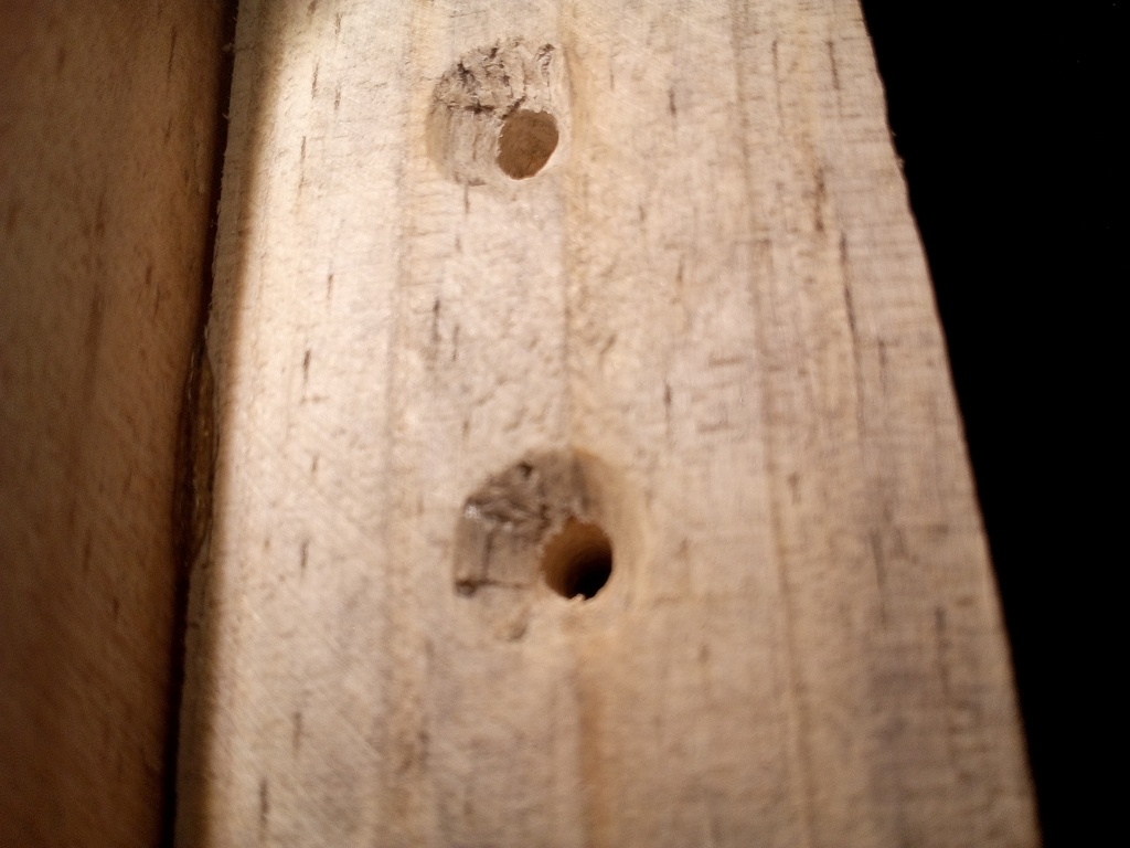 J'avais l'impression, à l’œil nu, de voir ces traces sombres aussi dans mes trous fraisés, mais en observant la photo, je me demande si finalement ça ne serait pas : soit des imperfections d'usinage, soit de petite galerie d'insectes xylophage ?