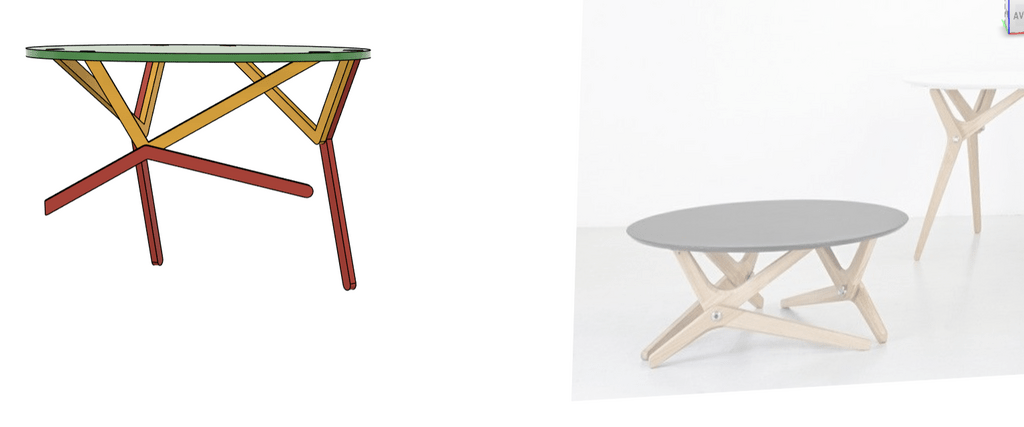 il y a quand même le challenge du sens des fibres , les pieds sont ils contre-collés ? si ce n'est pas le cas, en position table basse elle semble bien fragile. et les pieds font bcp d'éléments dans les pieds, pas très pratique. l'équilibre mécanique ne doit pas être complexe a étudier avec un logiciel paramétrique