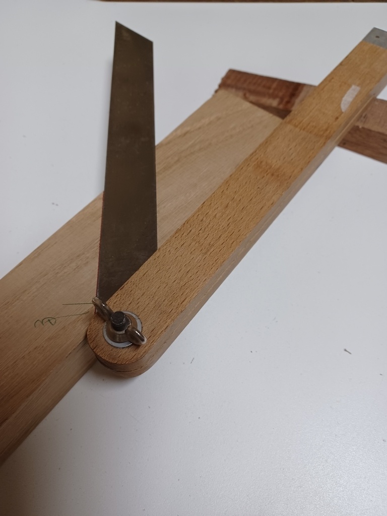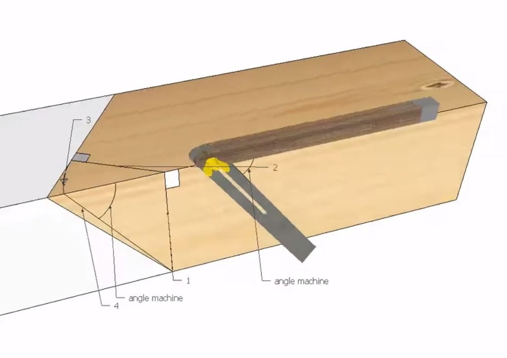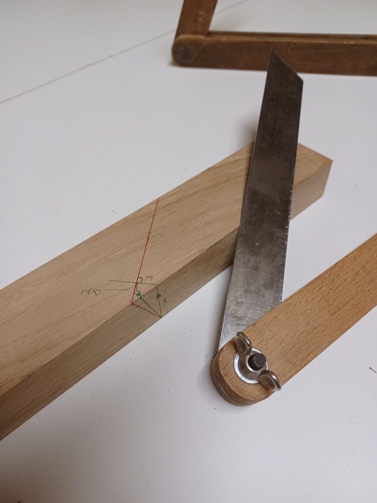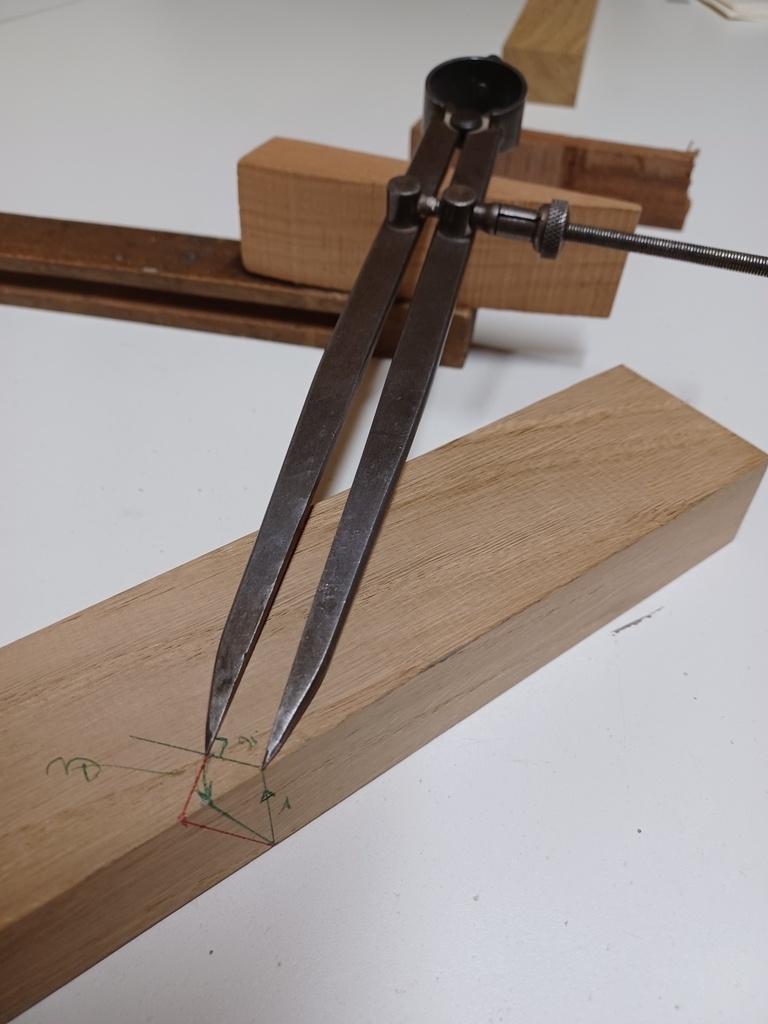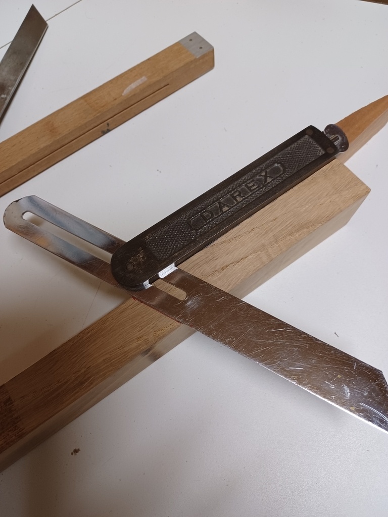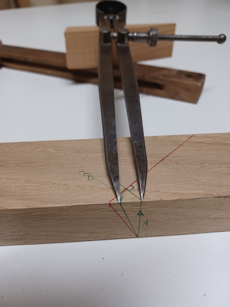 Cette courte vidéo va peut-être t'éclairer. Quand la pièce présente deux pentes différentes de 90 degrés il faut trouver l'angle de réglage de la machine, l'arc au compas sert à rabattre sur le chant de la pièce l'angle recherché