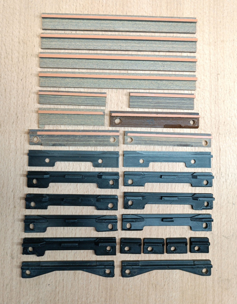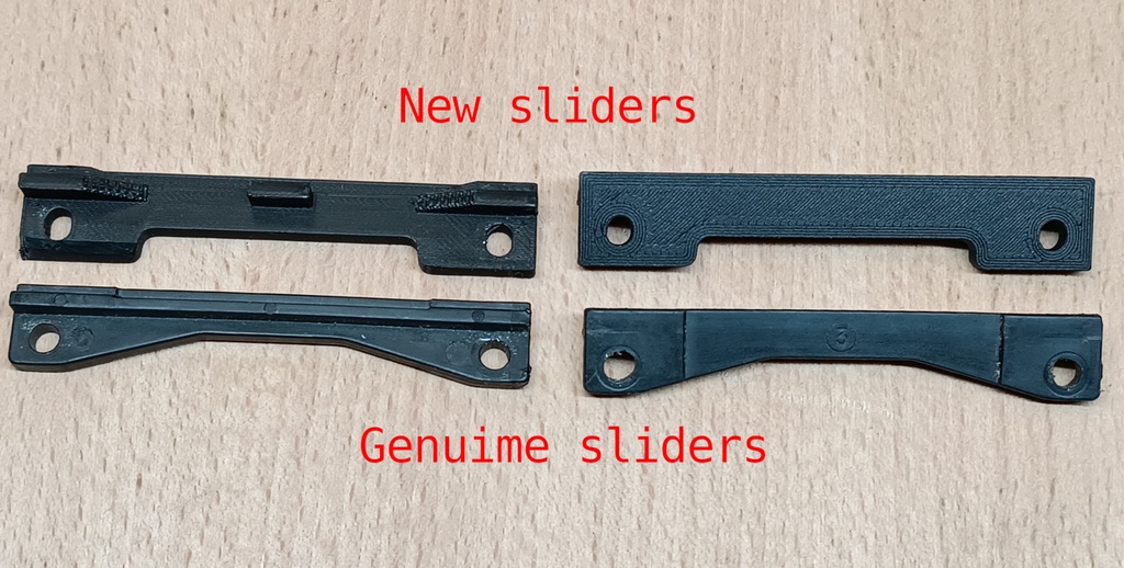 Du coup, comme j'ai depuis quelques temps une imprimante 3D, je me suis lancé dans la fabrication de nouvelles glissières, sans jeu ce coup-ci. Et après un certain nombre d'itérations, je suis arrivé à un résultat plutôt très satisfait : plus de jeu et plus de désaffleur ! cheers