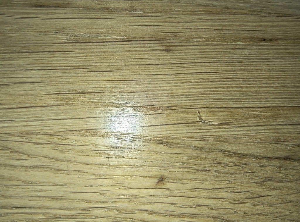 Malheureusement, la patte mouille ne récupérera pas grand-chose, dans un tel cas. C'est efficace, mais sur du bois brut, et dans des cas de faibles enfoncements ou impacts. Mais si c'est trop enfoncé, et avec des fibres arrachées et/ou cassées, comme c'est le cas ici, ça ne fera quasiment rien.
