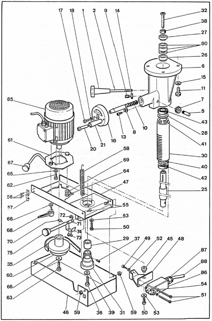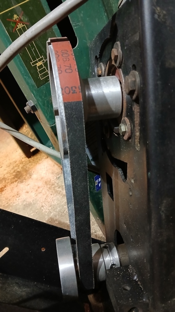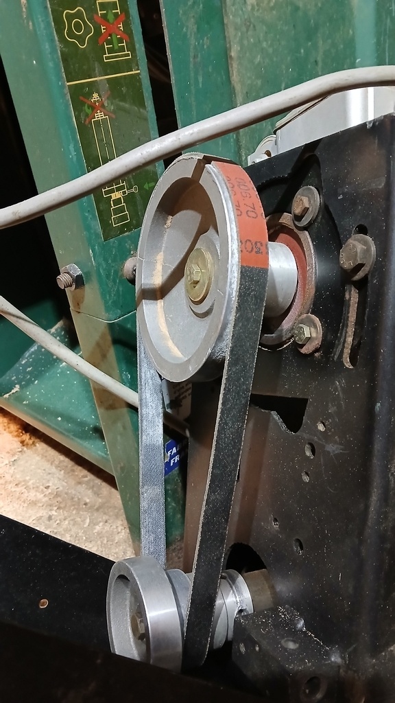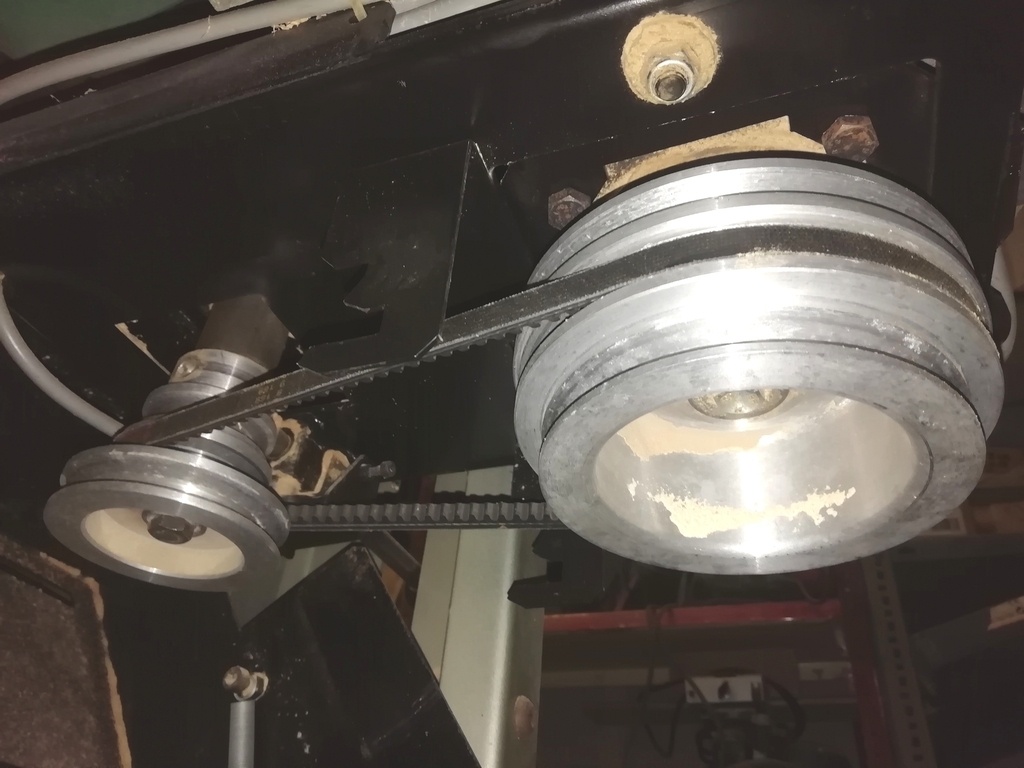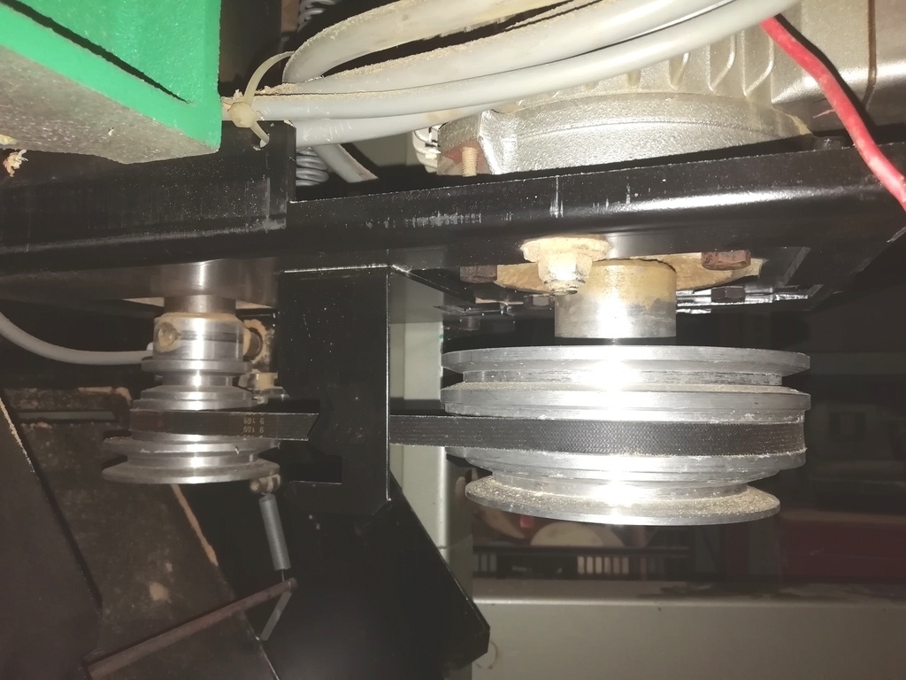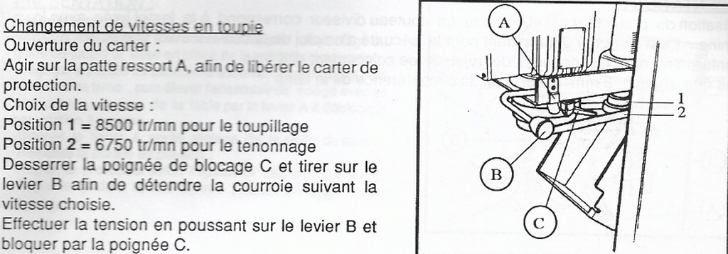 J'ai découvert que la poulie menante de la toupie (coté moteur) n'est pas d'origine ! Elle devrait avoir trois gorges et n'en en a qu'une ! J'ai une vu éclater que j'ai trouvé sur le net qui je pense correspond à ma machine mais, ne me donne pas plus de renseignement que ça (pièce N° 60 ). Je viens d'envoyer un mail à EMCL pour demander s'ils ont cette poulie à 3 gorges et si oui le coût. Je vous tiendrai informé de leur réponse.