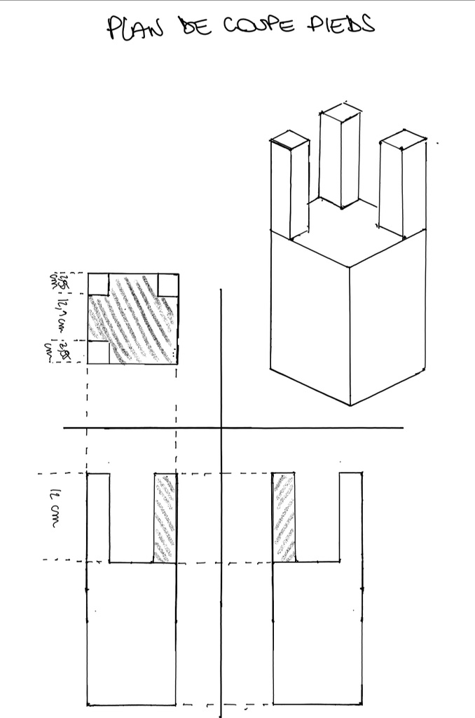 Les pieds viendront supporter l’ensemble, avec un assemblage en croix permettant un appui franc et sans décalage entre les faces.