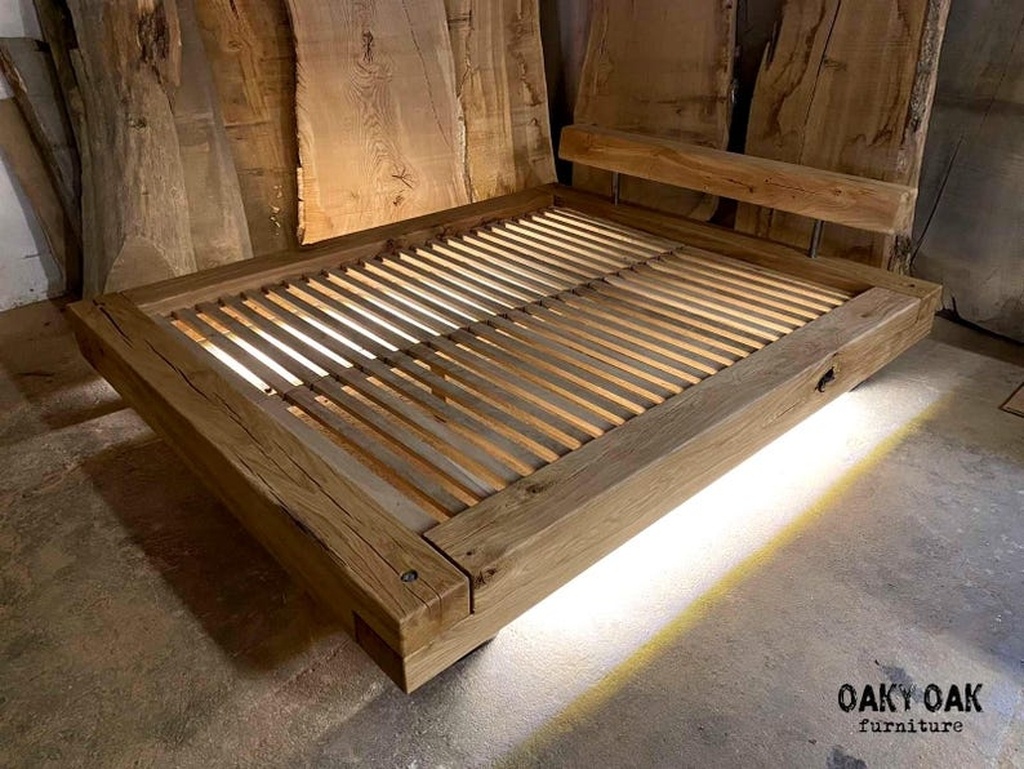 Il s’agit d’un lit 180 × 200 cm, réalisé à partir de poutres en chêne massif de section 120 × 120 mm.