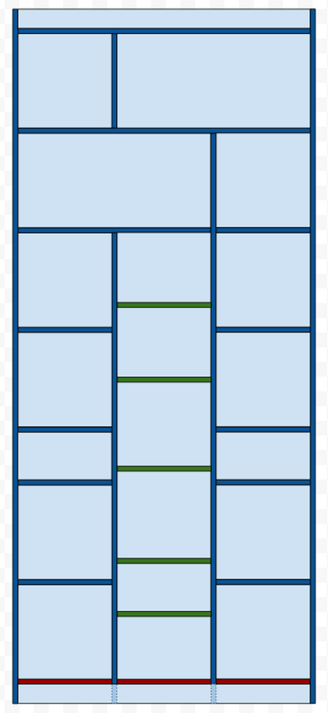 L'idée est de couvrir la hauteur totale de la pièce (2,49m). Pour l'échelle, les cases carrées font 34x34x34cm "utiles". Le meuble sera positionné contre un mur au fond (évidemment) et également à droite, moyennant l'épaisseur des plinthes (le montant vertical de gauche sera un peu plus profond pour rattraper la plinthe du fond, et je rajouterai un tasseau à droite à l'avant pour rattraper la plinthe de droite). Les 4 montants verticaux reposent sur le sol. Le bois sera du hêtre lamellé-collé de 18mm.
