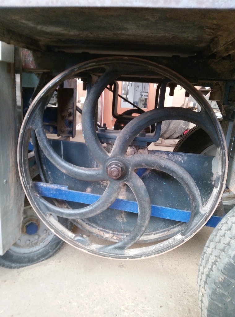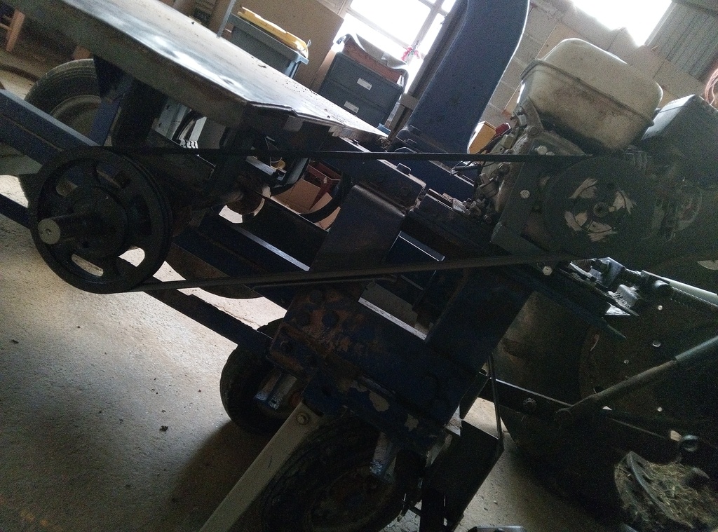 Machine qui semble ancienne, dont je ne connais ni la marque ni le modèle, il n'y a pas la moindre inscription ou plaque dessus (elle a, en plus, été modifiée pour être attelée à un tracteur et fonctionne avec un moteur thermique).