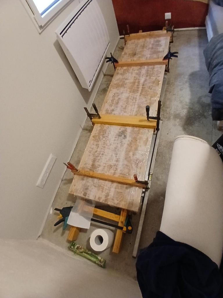 J'ai mis la partie concave vers le haut, j'ai humidifié (peut-être un peu trop ?) avec sopalin, film plastique et j'ai laissé à température de 16° 1 semaine (où j'étais en vacances ailleurs) avec serre-joints.