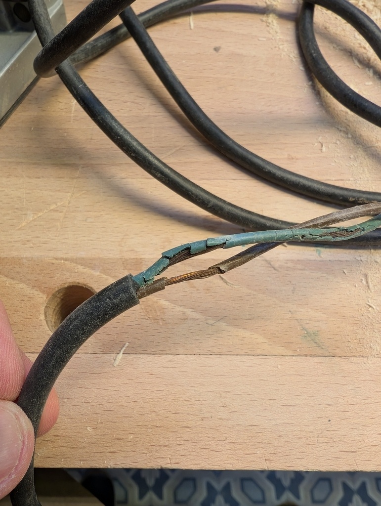 En usinant du bois à la défonceuse, la fraise a accidentellement abîmé la gaine de protection du câble d'alimentation de ma défonceuse (une Ryobi d'une vingtaine d'année).