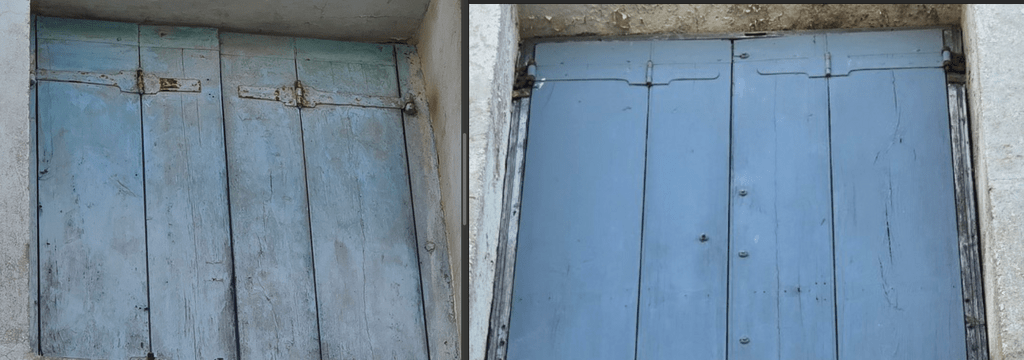 Les deux "demi vantaux" existants sont chacun dotés d'une feuillure en miroir. Et le "demi vantail central" également une feuillure pour s’emboîter sur l'autre vantail et offrir un recouvrement.