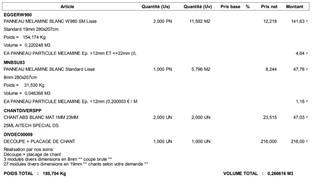 Je m'étonne du prix annoncé, c'est la première fois que je demande un devis pour le placage des chants donc ne me rends pas bien compte des tarifs appliqués.