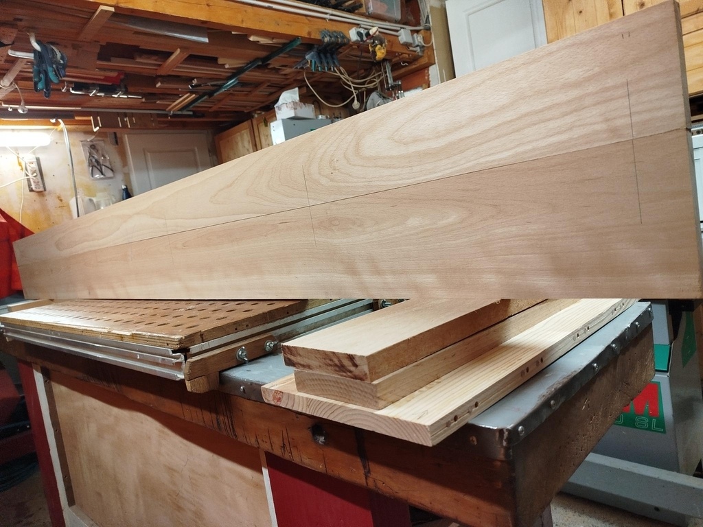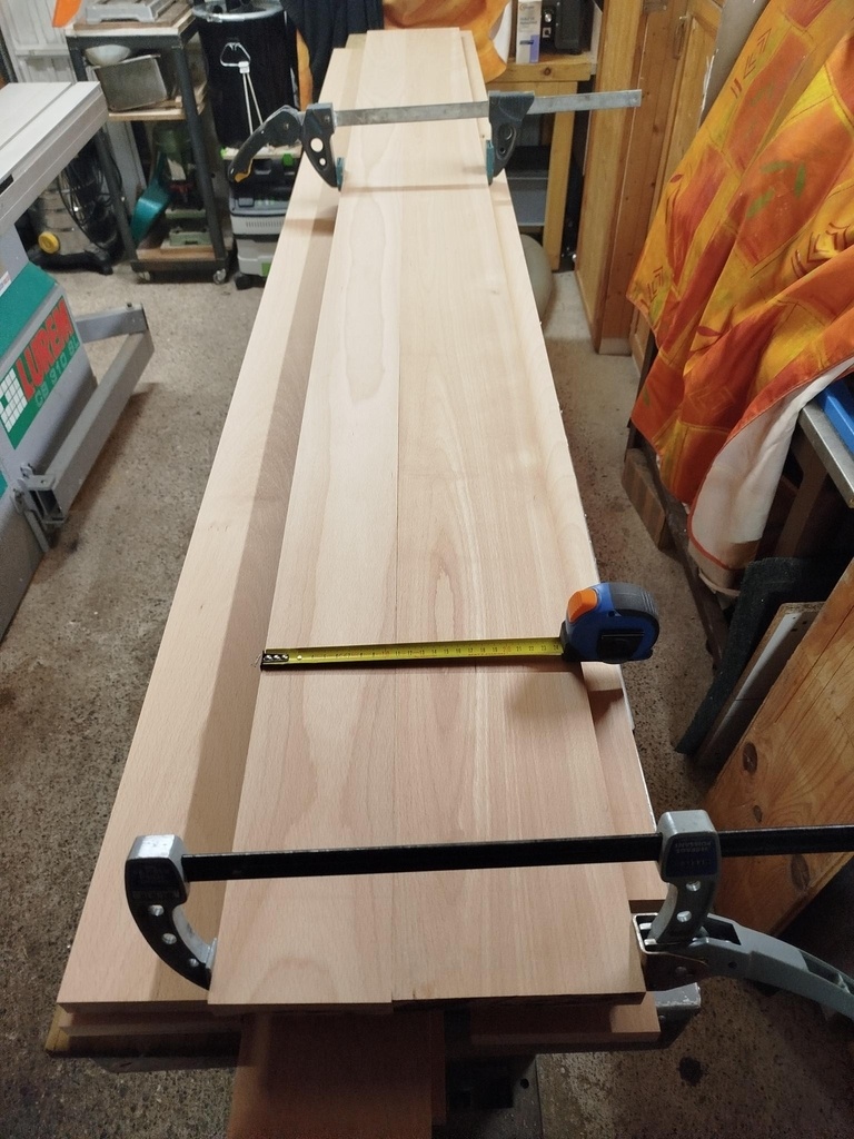 Je suis en train de préparer des avivés en hêtre pour réaliser une claustra sol-plafond ondulée en 12 lames de 2450x120x22.