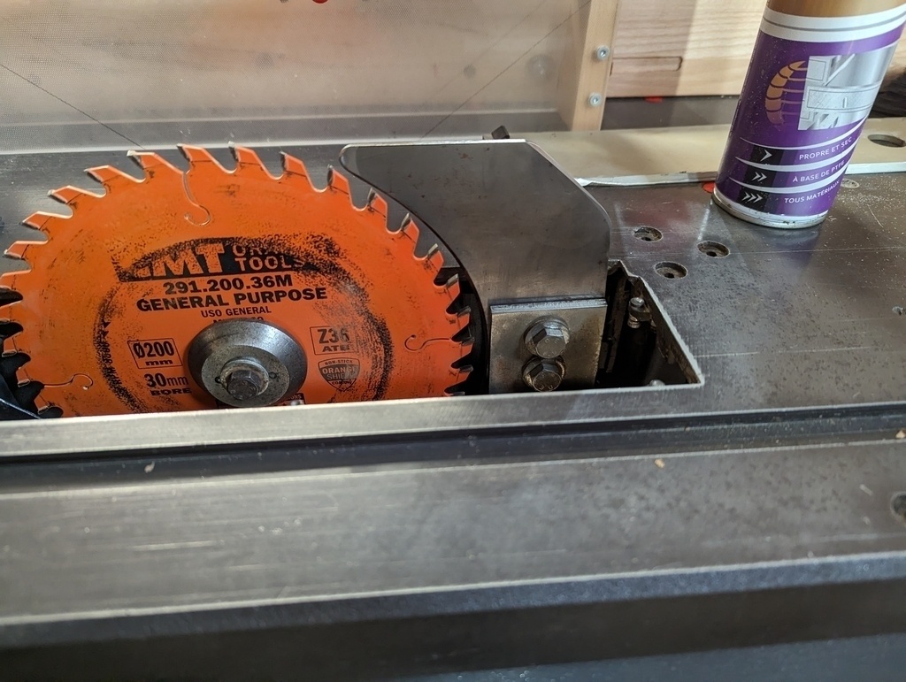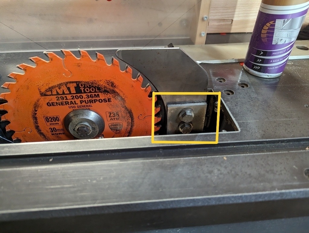 Je pense pouvoir facilement refaire 2 carrés de métal avec des trous. Néanmoins je suis pas certains de bien comprendre l'ordre de montage. Pourriez vous me confirmer que la plaque 212 est placée devant le couteau diviseur (213), lui même devant la plaque 214, elle même devant le plaque 205 ? Aussi si quelqu'un pourrait m'indiquer l'épaisseur des tôles 212 et 214, cela m'aiderait bcp ! J'imagine que l'épaisseur est faite pour centrer la lame de la scie par rapport au couteau diviseur. Ca me semble pas négligeable en terme de sécurité donc.
