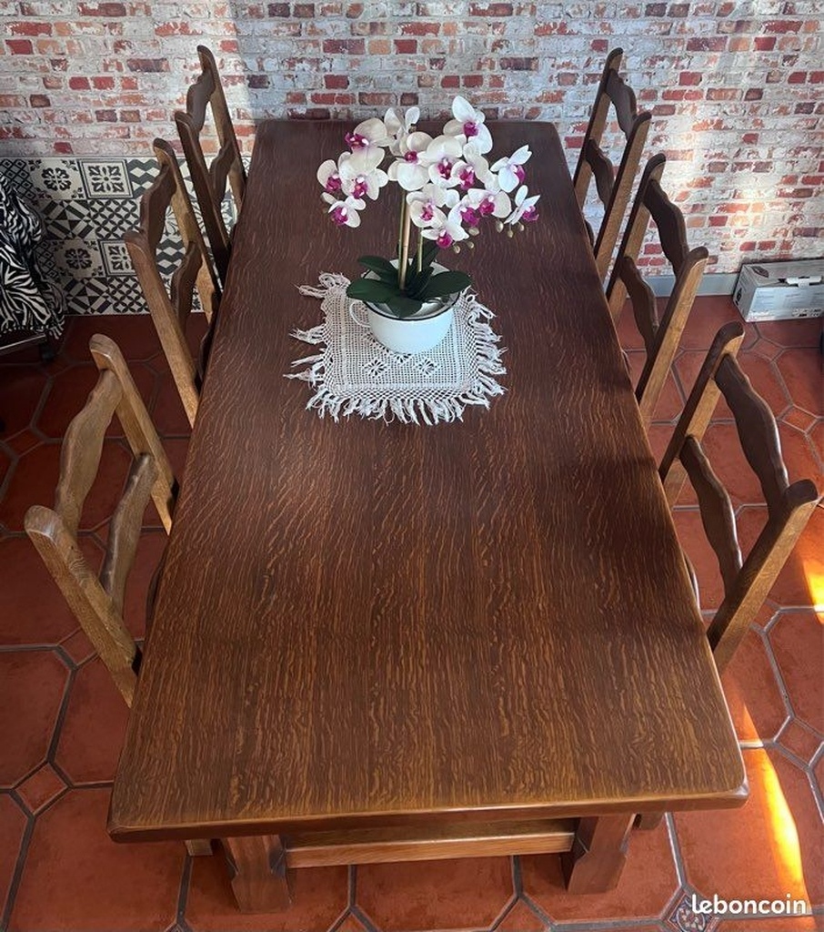 Le plateau est en chêne teinté, on reconnait bien là maille caractéristique du chêne. Parcontre vu la répétition du motif et le fait qu'il y ai des emboîtures en périphérie avec le sens du fil contraire je penche plutôt pour du placage avec emboîtures.