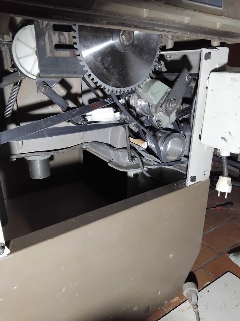 Les machine de cette game sont à embrayage par tension de courroie. S'il y a entraînement d'un outil non sélectionné c'est que sa courroie d'entraînement frotte suffisamment sur la poulie menante (moteur) pour être entraînée. Cela peut se produire si la courroie a pris une forme lors de son conditionnement. C'est assez flagrant sur la courroie de scie au premier plan. Elle est anormalement déformée. En les faisant tourner chacune leur tour un certain temps elle vont peut-être se réchauffer et de détendre.