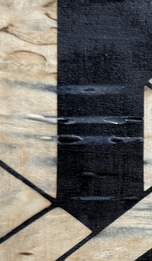 Je commence à m'y retrouver un peu mais aujourd'hui pour ce nouvel essai après avoir enlevé les rubans adhésif j'ai poncé et je me retrouve avec ceci, je ne comprends pas la cause et j'aimerai éviter que ça se reproduise à l'avenir.