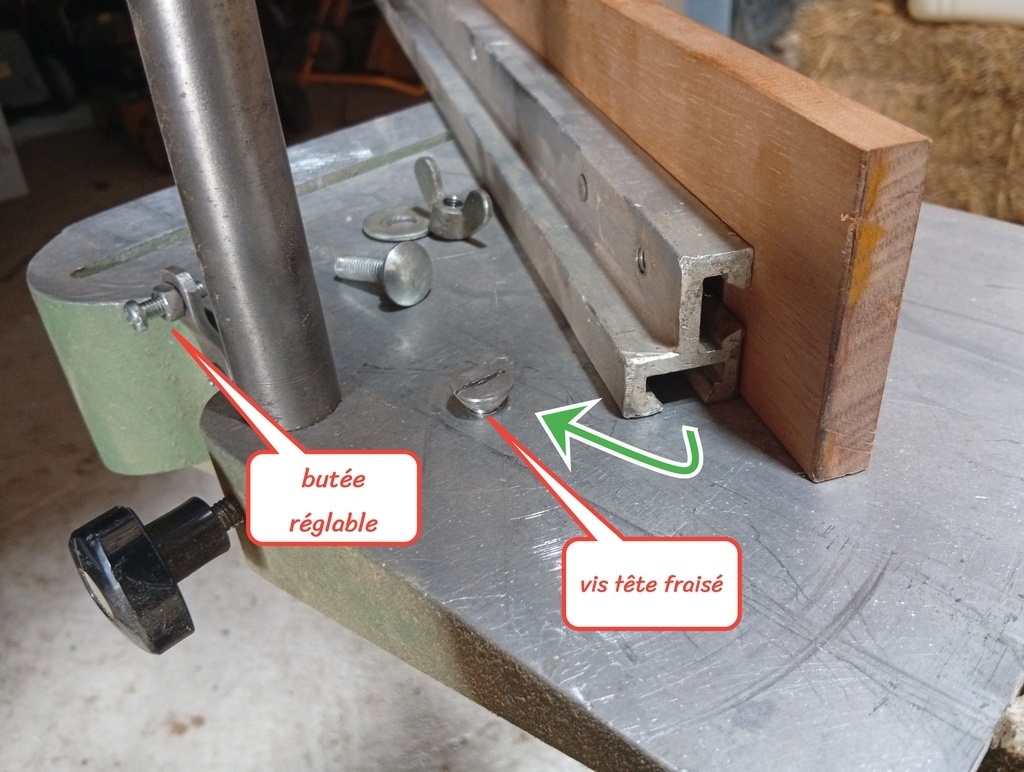Deuxième question : j’ai le rail guidé qui sert à faire du tronçonnage, j’ai un petit bloc alu qui vient se loger dedans et sert à serrer le rail grâce à une vis sous le chariot, je suppose donc qu’il me manque un deuxième bloc alu pour venir « régler » ce rail dans la rainure située à gauche du chariot ? Et l’équerrage se fait à la main du coup ? Je joins une photo, je sais que j’ai tendance à m’éterniser par écrit