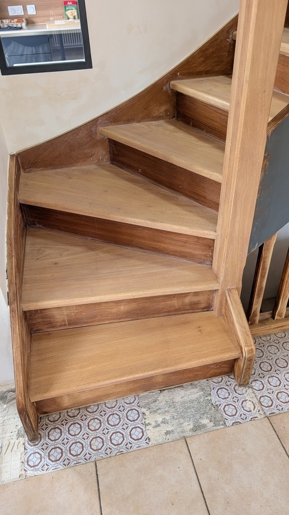 Je me suis mal exprimé : il y a deux mois, alors que les marches étaient à l'état brut, j'ai testé un vitrificateur sur la première marche. N'étant pas satisfait du résultat, j'ai reponcé cette marche pour faire disparaître le vitrificateur.