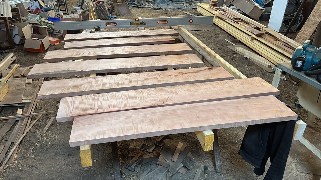 En conséquence avoir un plateau constitué de planches large est un choix qui peut causer des déformations qu'il faut assumer. J'ajouterais qu'il est plus dur d'obtenir un corroyage parfait quand on travail proche des capacités max des machines à disposition. La largeur "idéale" des plateau à préparer pour le collage dépend du bois (sur un arbre de 90cm de diamètre il est possible de faire un plateau de 4àcm stable sans collage) ; des machines ; de l'usage final (par exemple mon plan de travail me sert directement de billot de découpe, il est donc non vernis et régulièrement lavé à grandes eaux => j'ai préféré limiter le nombre de collages
