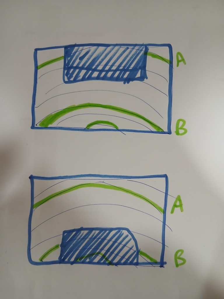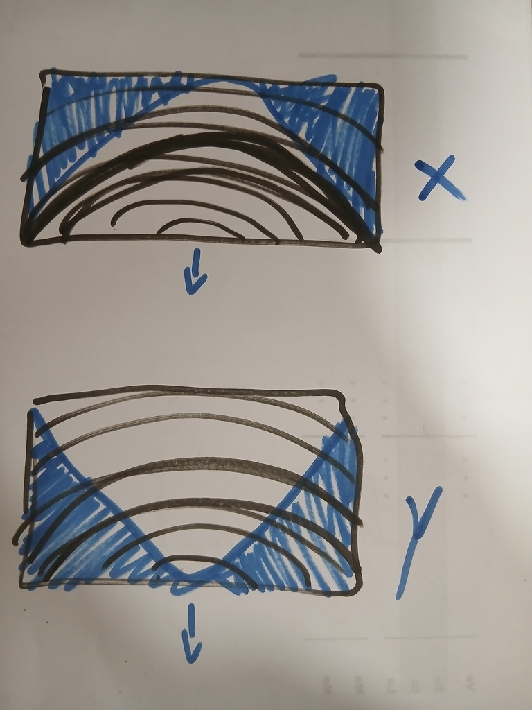 Seconde question.. seconde image. On sort souvent des pièces qui ne matchent pas avec l'image rectangulaire qu'on a tous en tête pour expliquer le retrait. (Le bleu étant la partie enlevée). Vaut-il mieux garder ae grand côté dans le coeur (x), ou dans la dosse(y) pour limiter les déformations (sachant que l'assise de la pièce n'est pas la question, car on peut se retrouver autant avec du retrait qu'avec du gonflement).