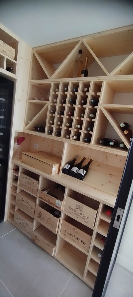 Quelques exemples, ci-dessous, de mobiliers réalisés de la sorte, le premier pour un meuble de restaurant (en mélaminé), les 2 autres pour une cave à vin chez un particulier (en agglo replaqué chêne). Et le quatrième pour un magasin (en triply pin).