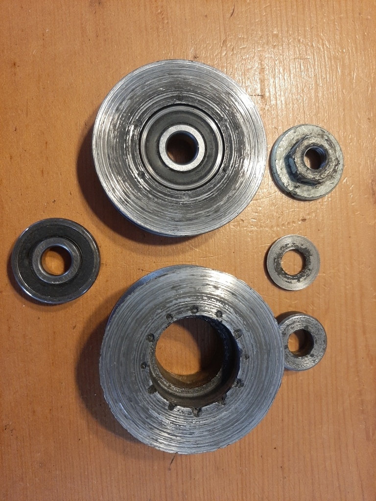 Voilà la double poulie en question. Les roulements ne sont pas montés serrés sur les poulies et glissant sur l'arbre comme il devraient l'être mais avec du jeu.