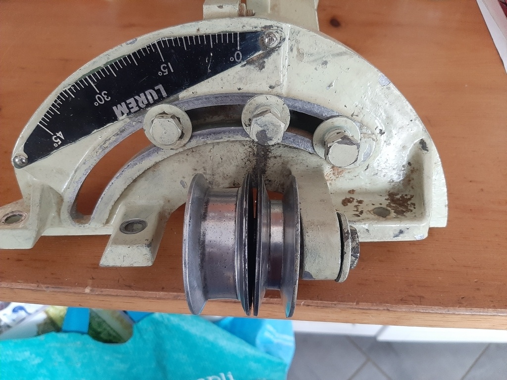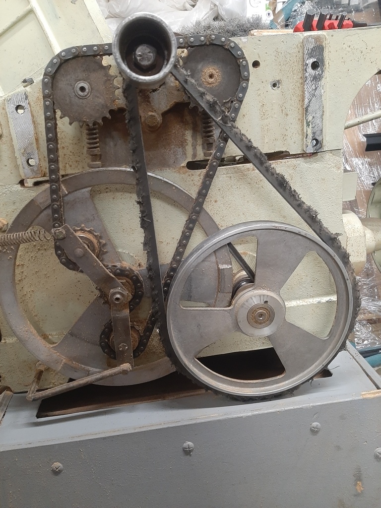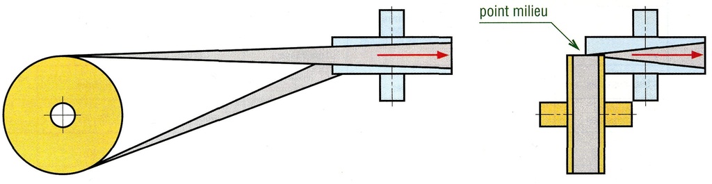 Je ne connais pas cette machine mais des poulies montées sur un support tournant de 0 à 45 deg servent assez probablement à rediriger les courroies de profil différents vers deux poulies qui peuvent se pivoter de 0 à 90 deg.